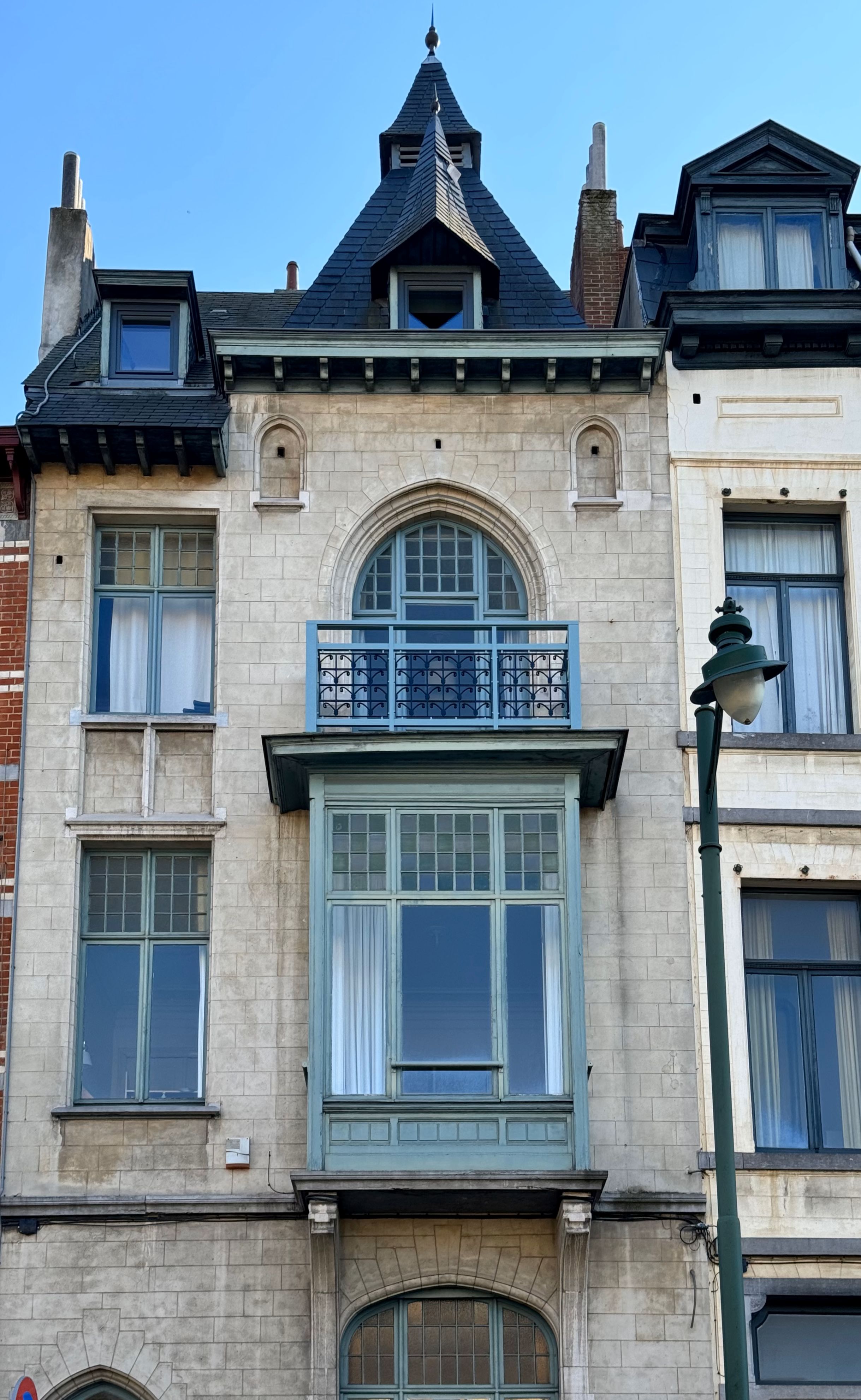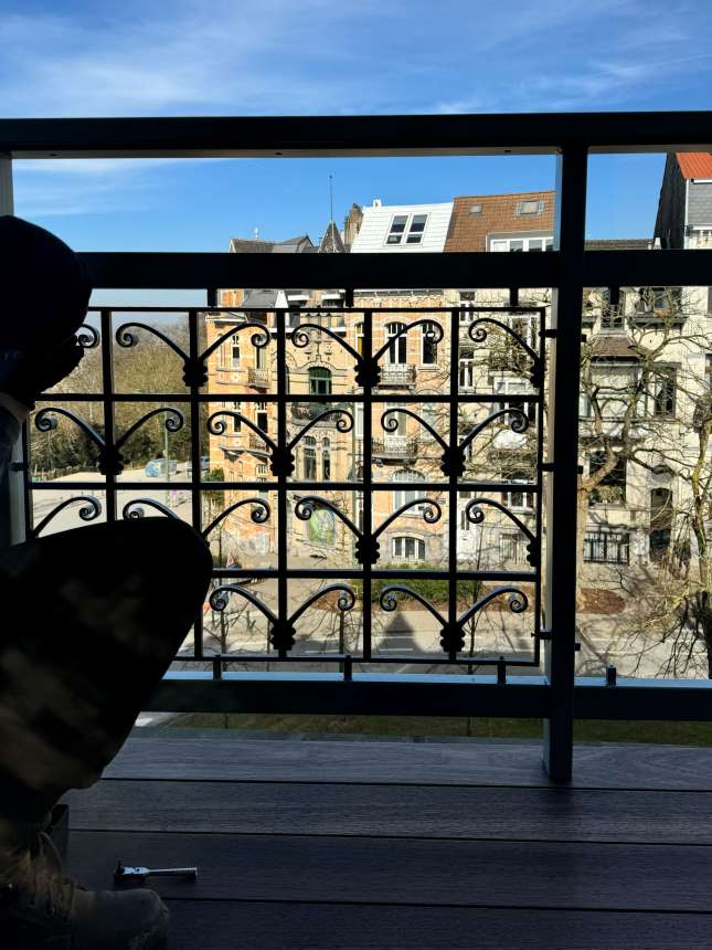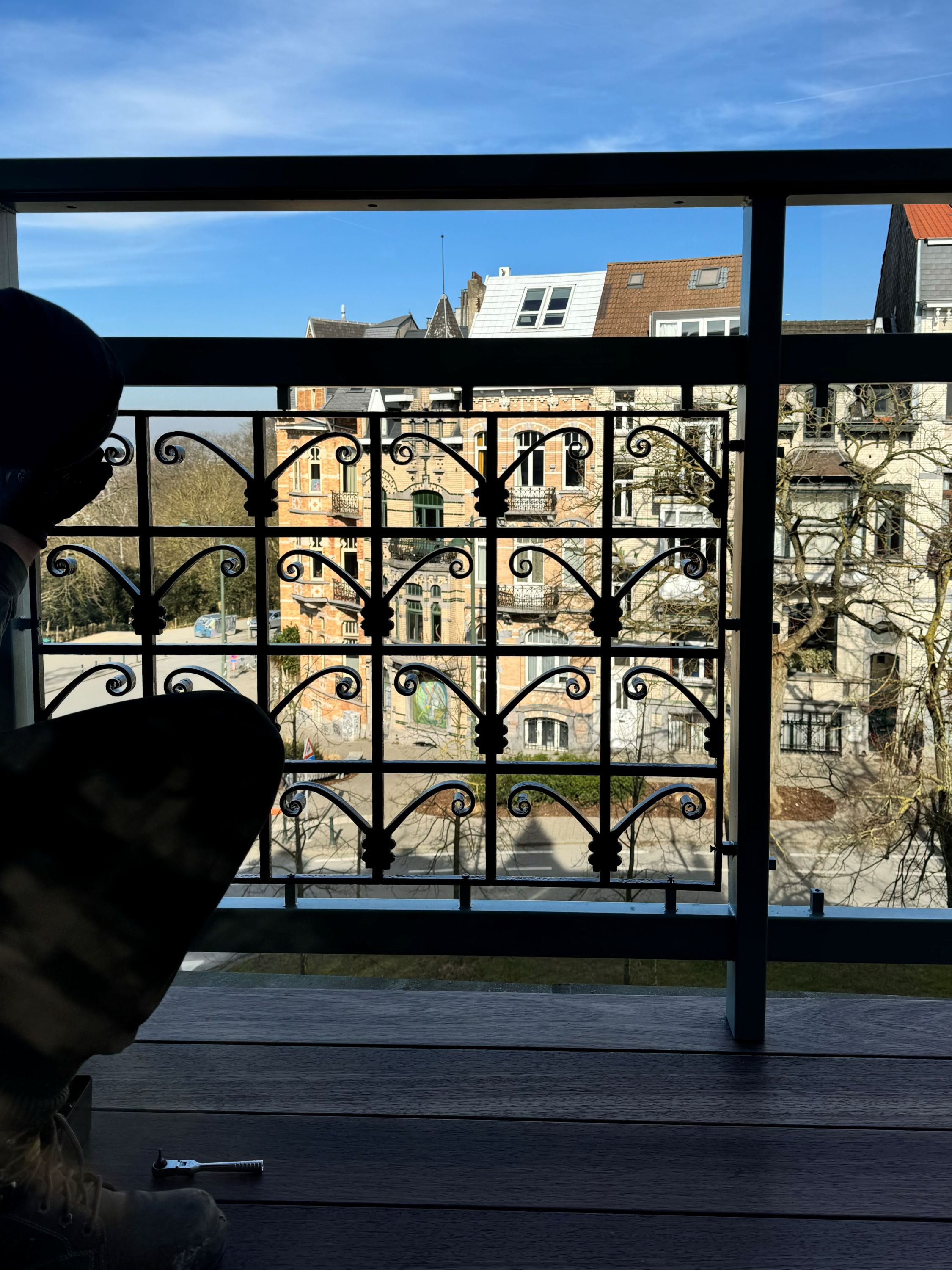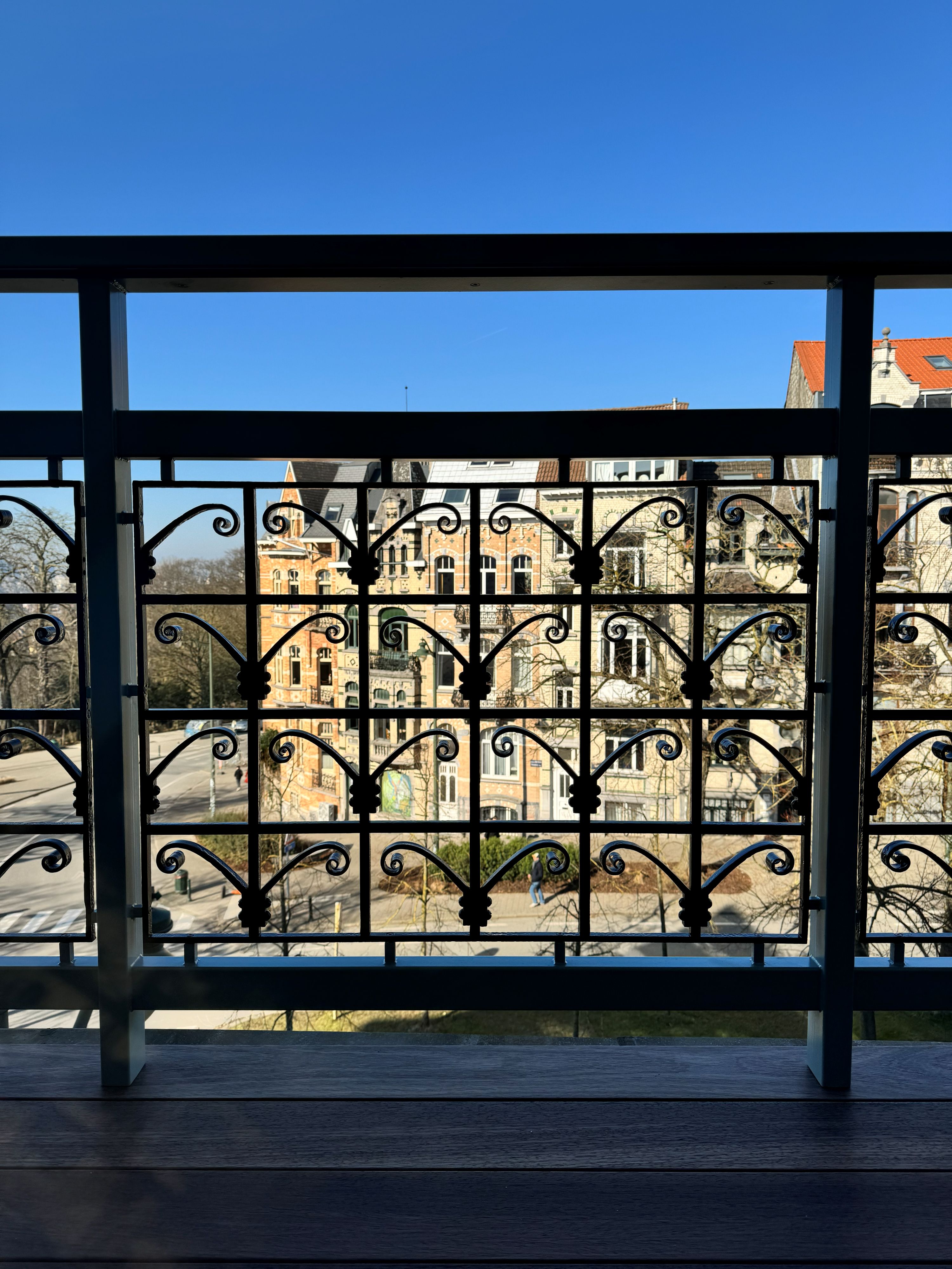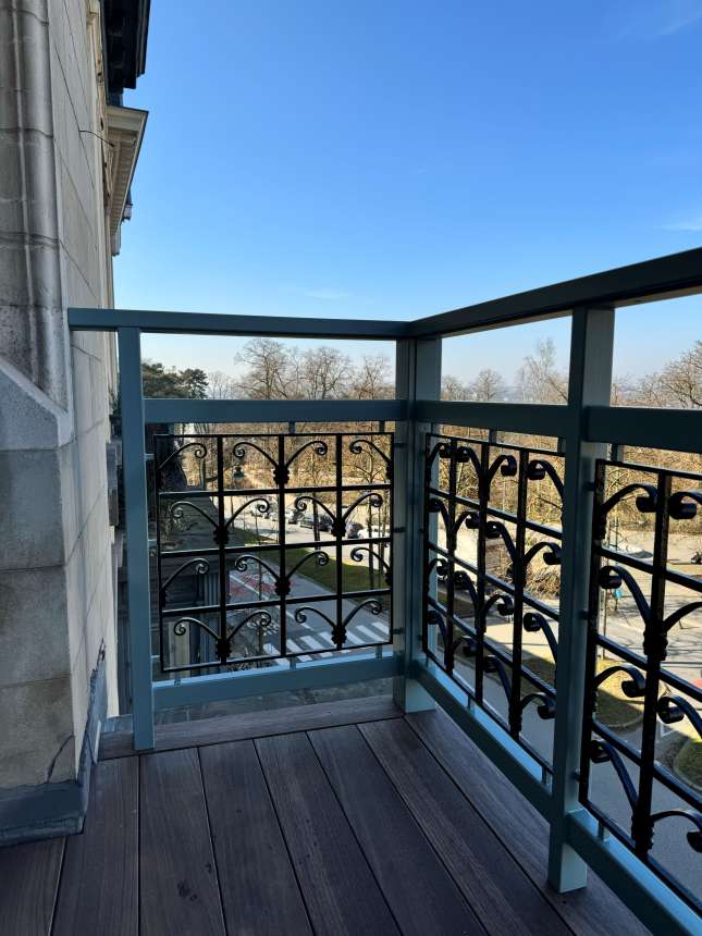 Ferronnerie existante, restaurée et instalée dans de nouveaux cadres. Fixations invisibles, motifs: RAL9005 satiné, structure: NCS S 4010B50G, Duck Blue Egg ou Bleu Rococo