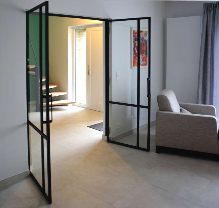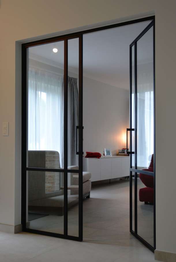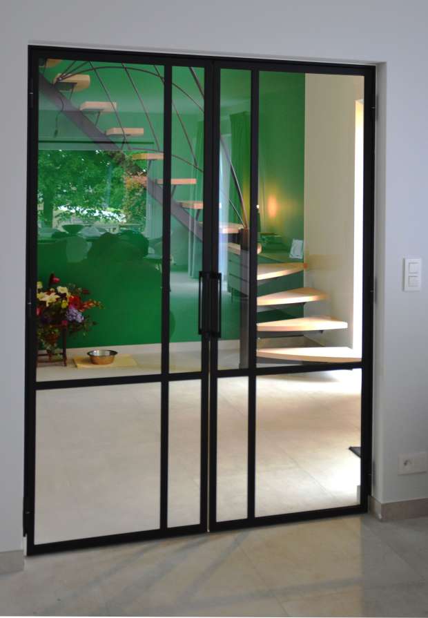 Doube porte vitrée, poignée à façon, verre feuilleté, RAL9005 texturé
