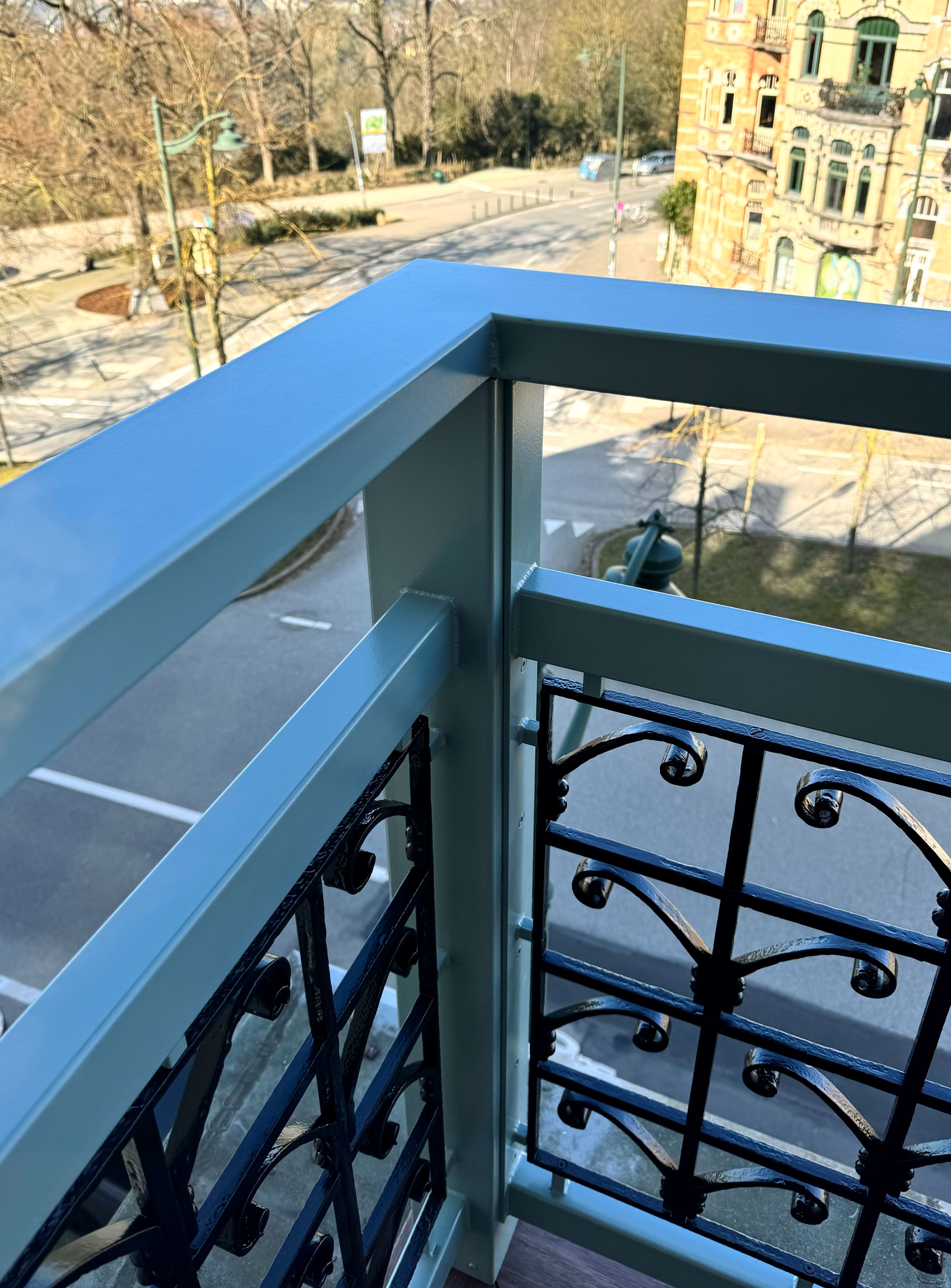 Ferronnerie existante, restaurée et instalée dans de nouveaux cadres. Fixations invisibles, motifs: RAL9005 satiné, structure: NCS S 4010B50G, Duck Blue Egg ou Bleu Rococo