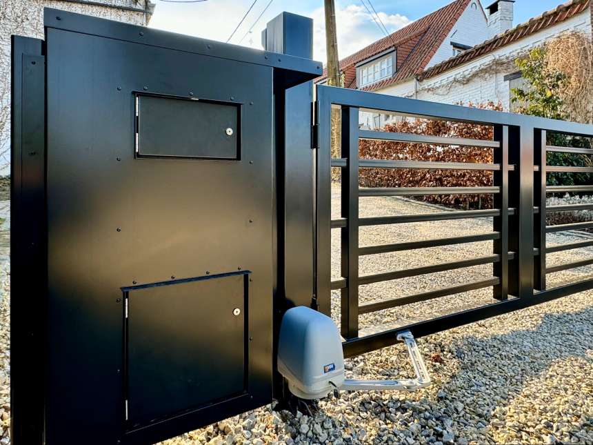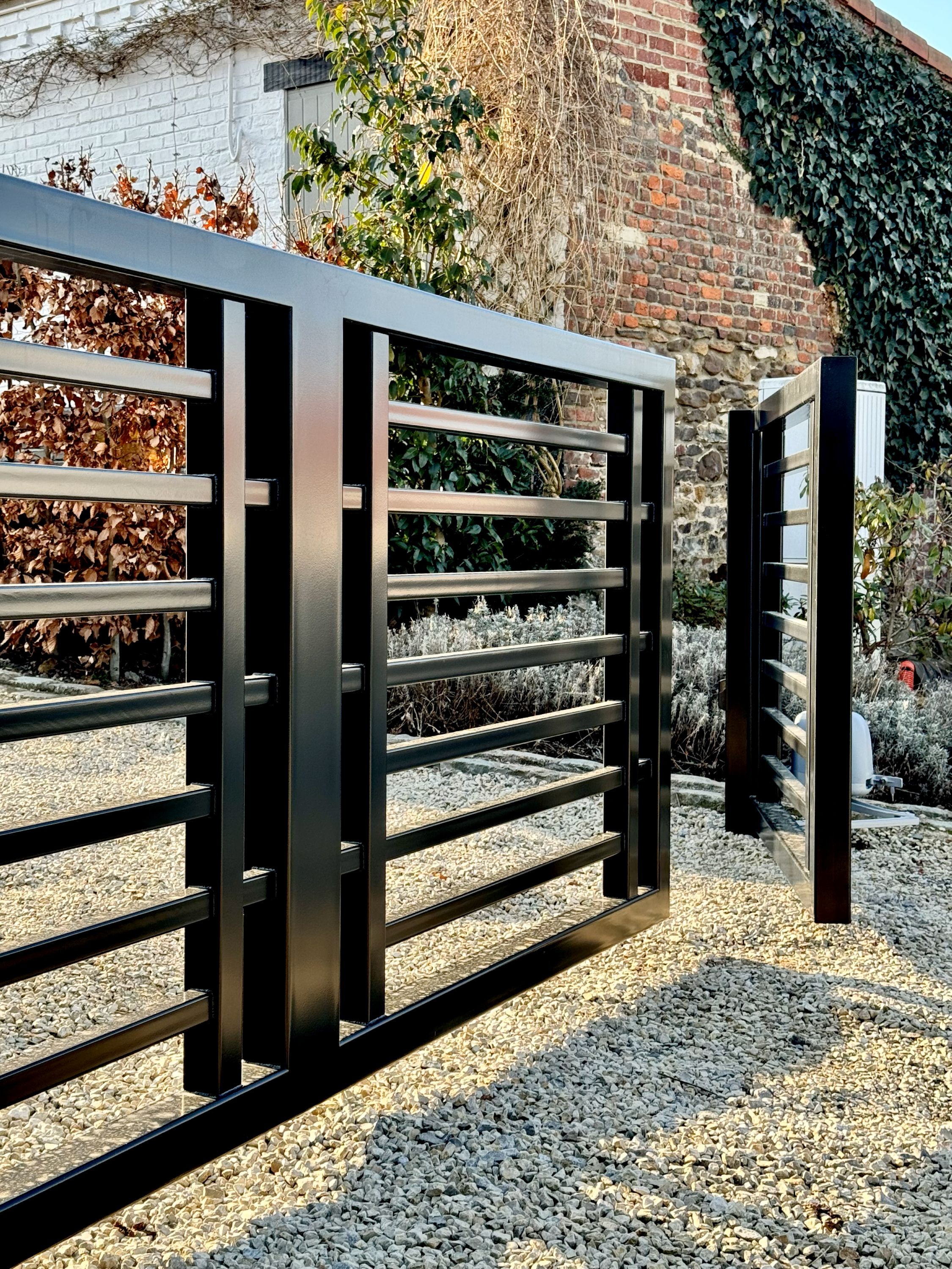 portail double, battants inégaux, motorisation VDS, RAL9005 satiné