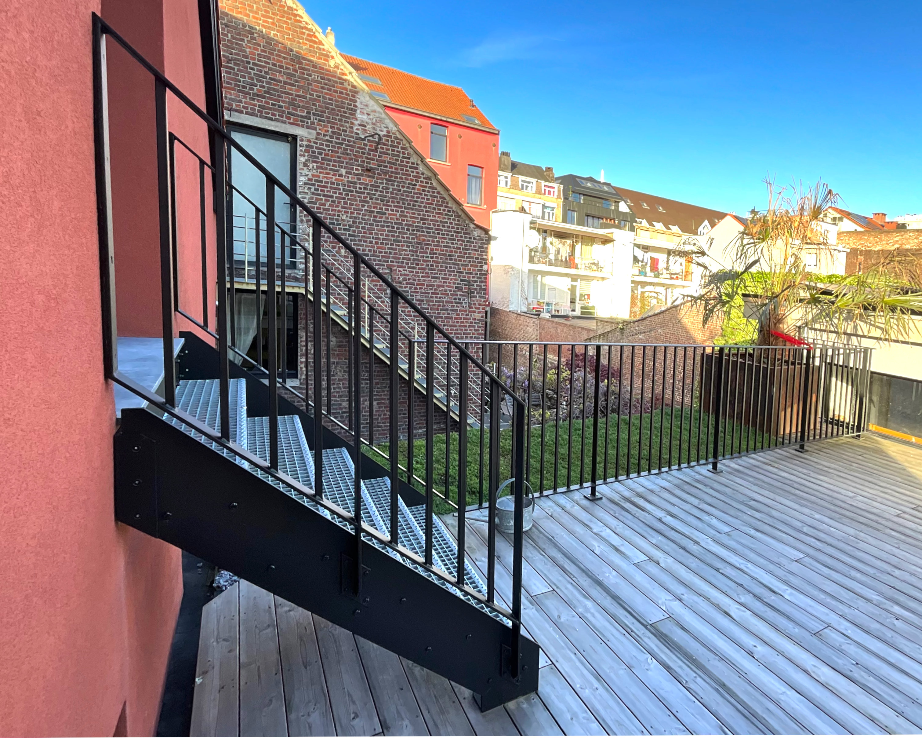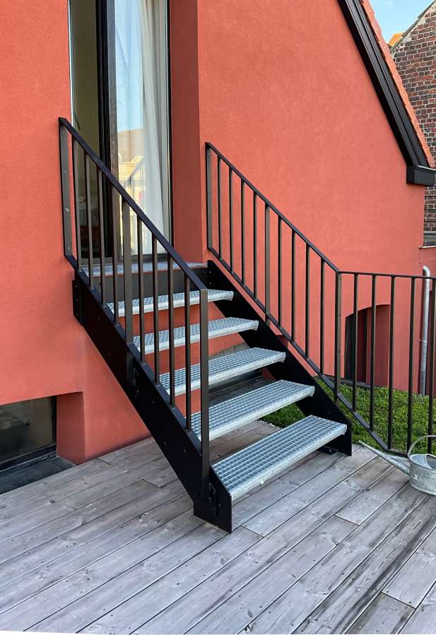 Garde-corps et escalieer pour terrassse sur plateforme. Marche caillebotis 30x30, RAL9005 structuré